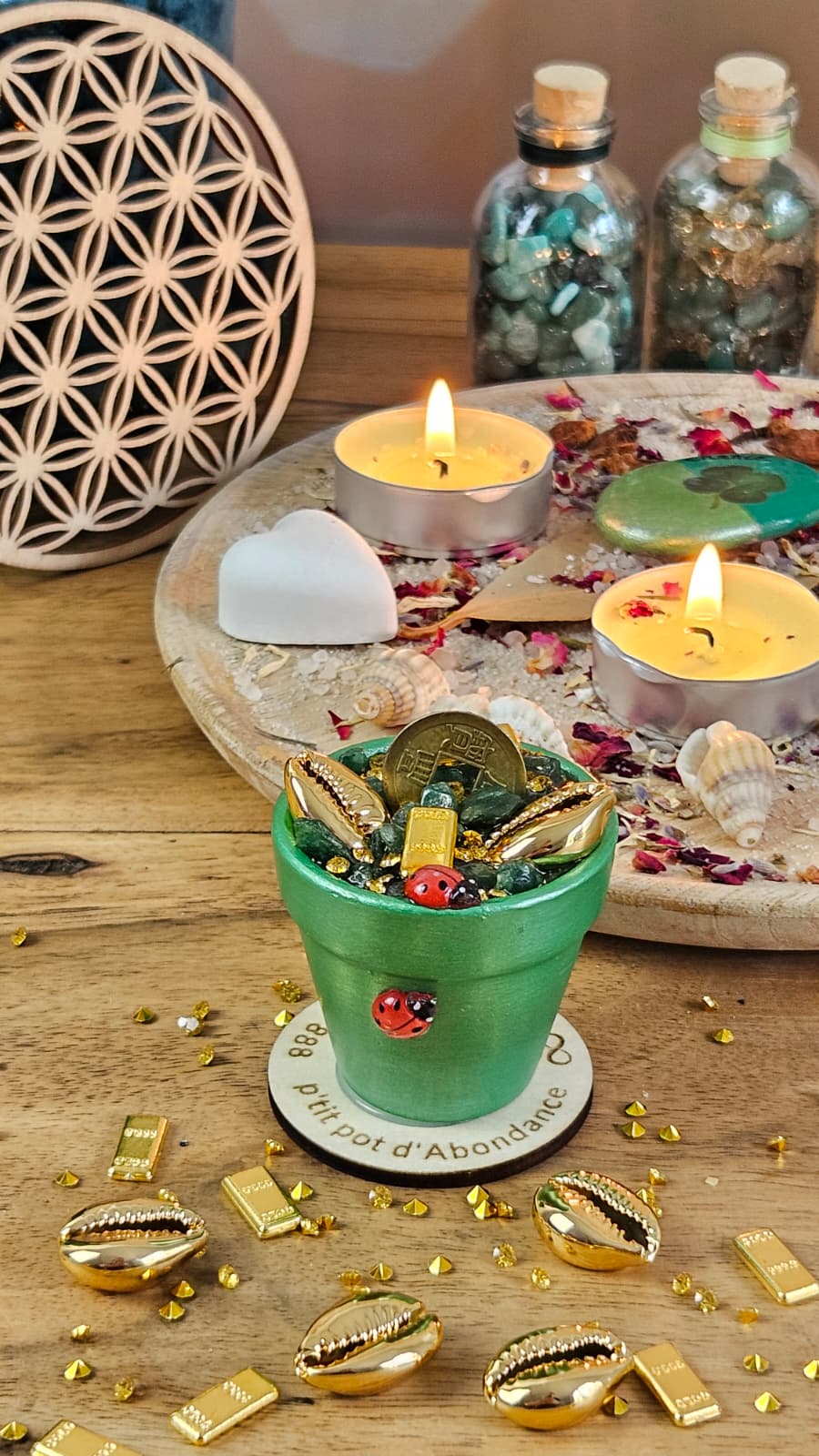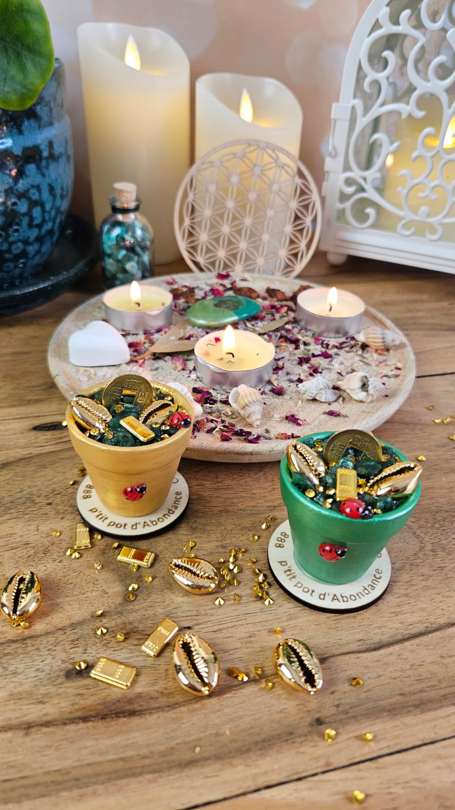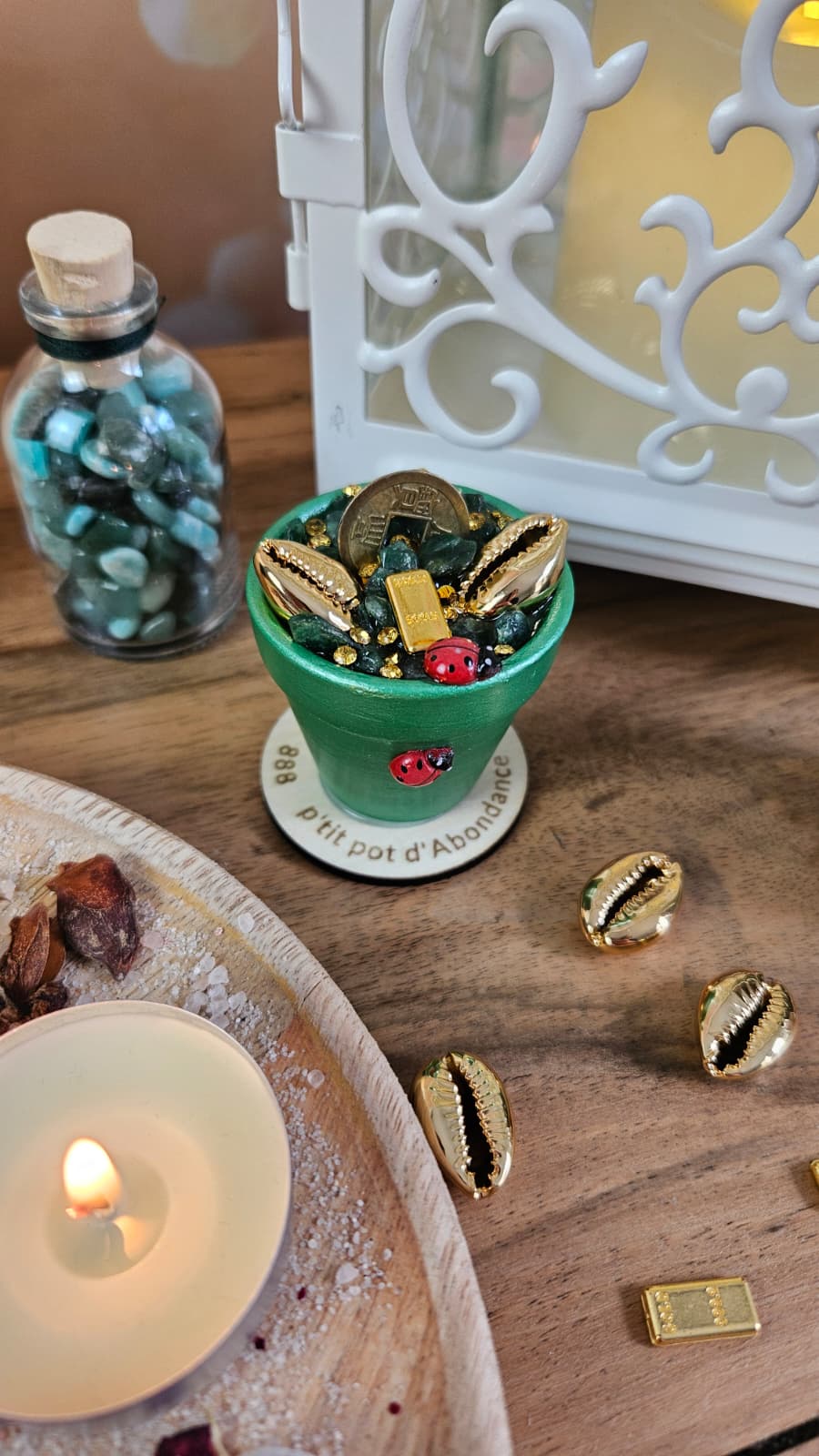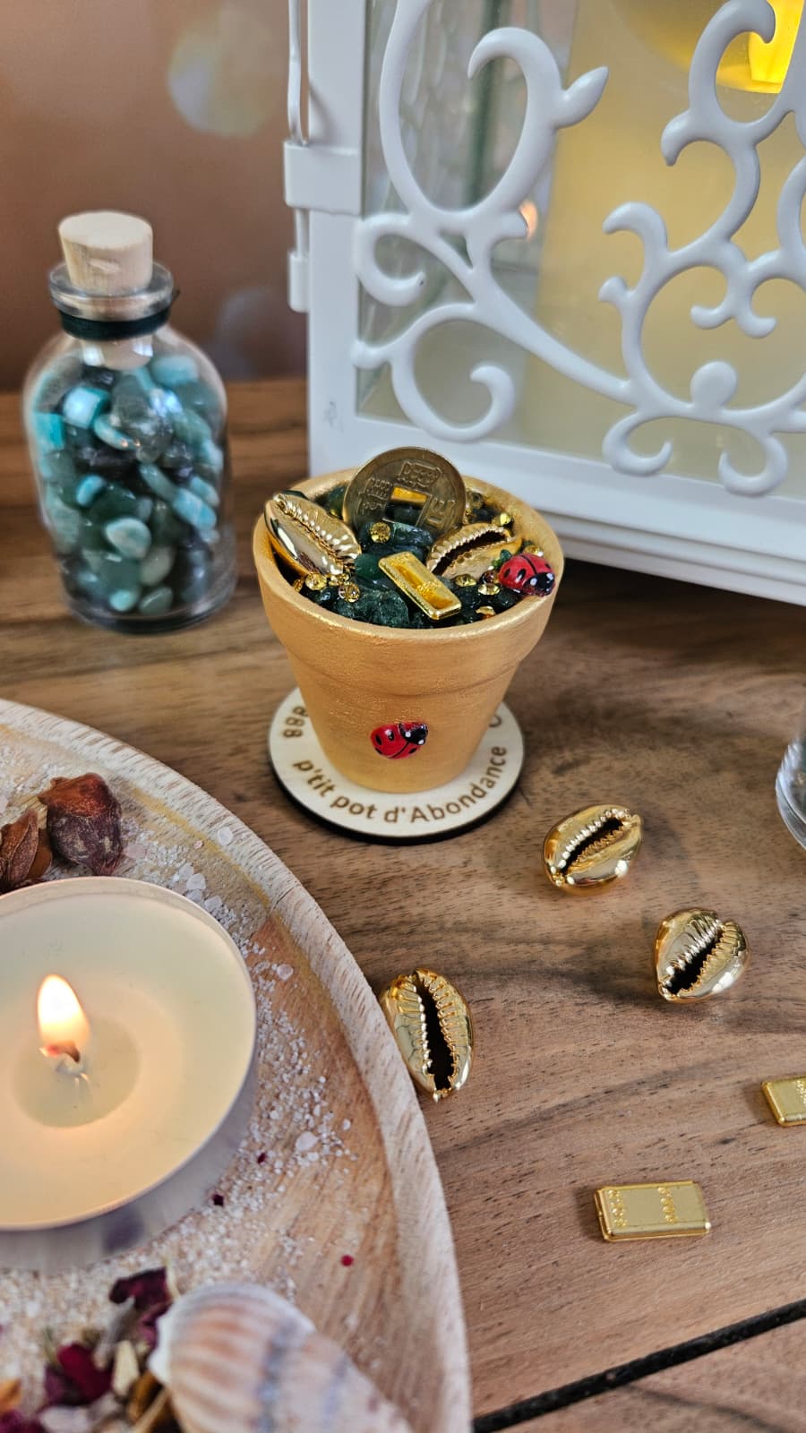 Voici la version à poser de mon P’tit Pot d’Abondance, spécialement imaginée pour accompagner vos rituels, créer un espace sacré ou vibrer au quotidien avec l’énergie de la prospérité.
