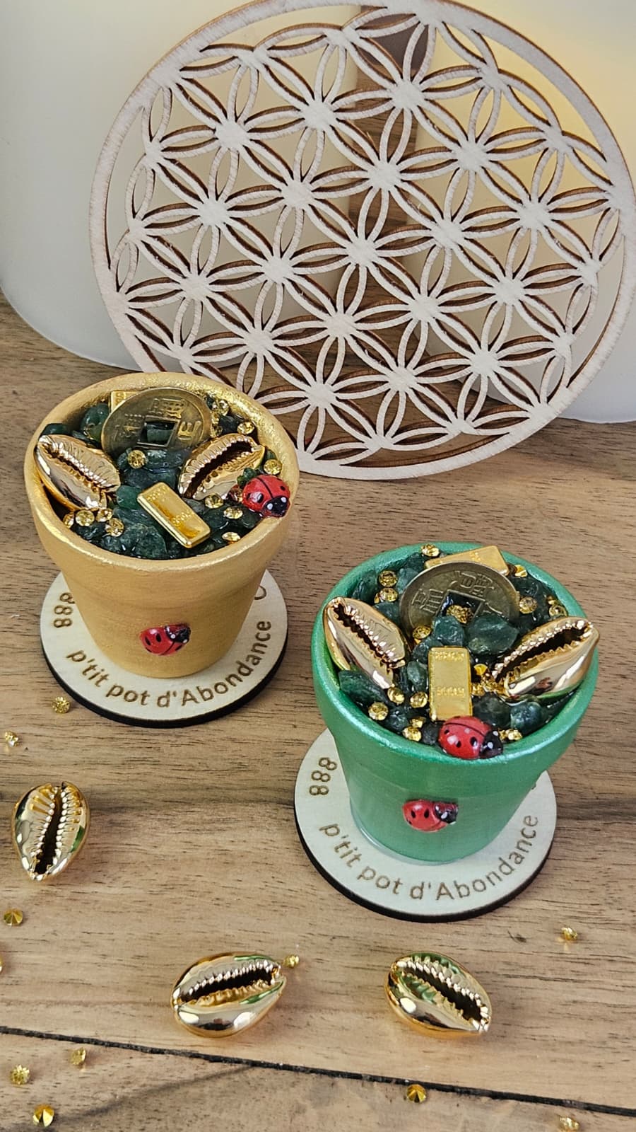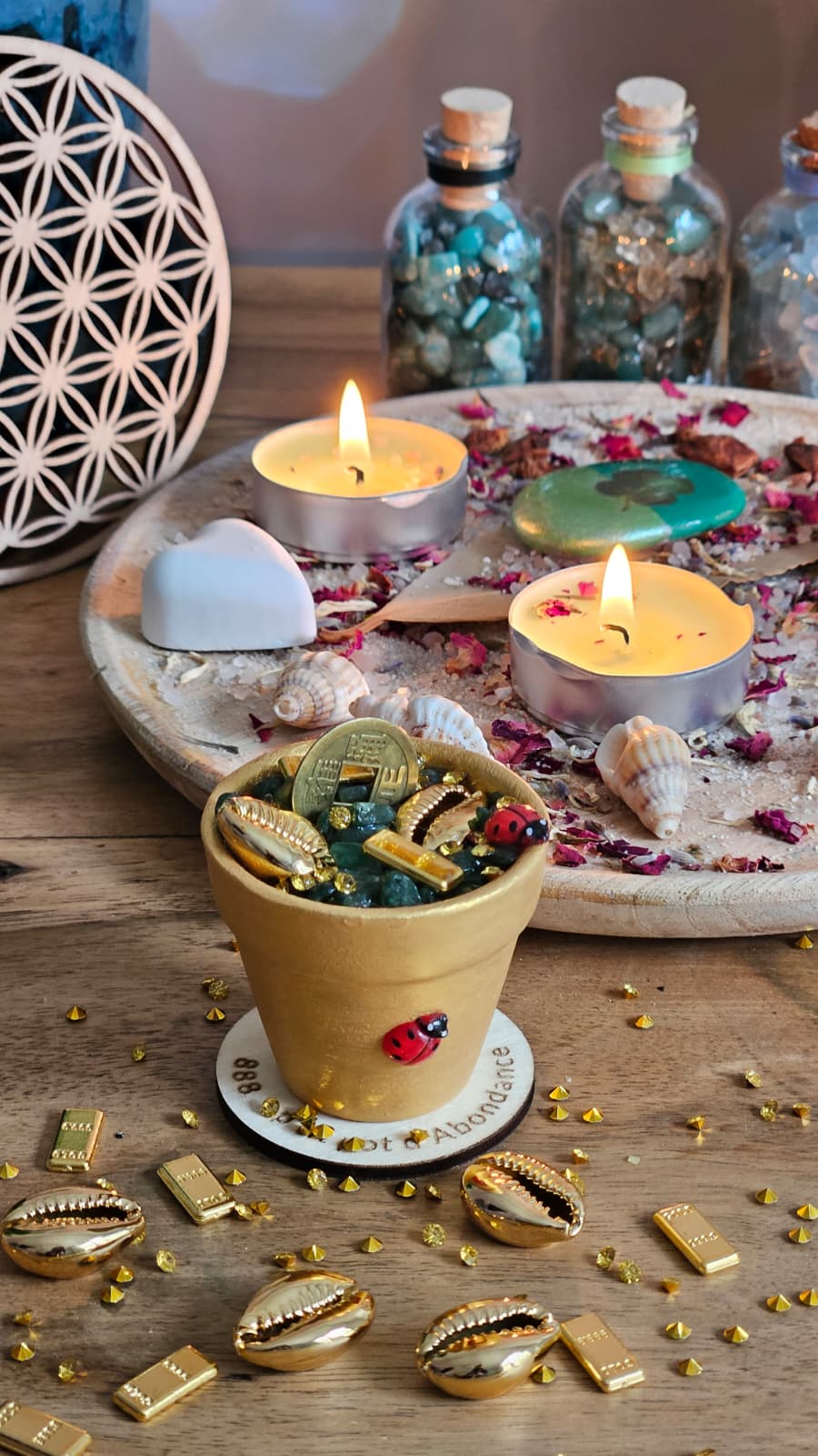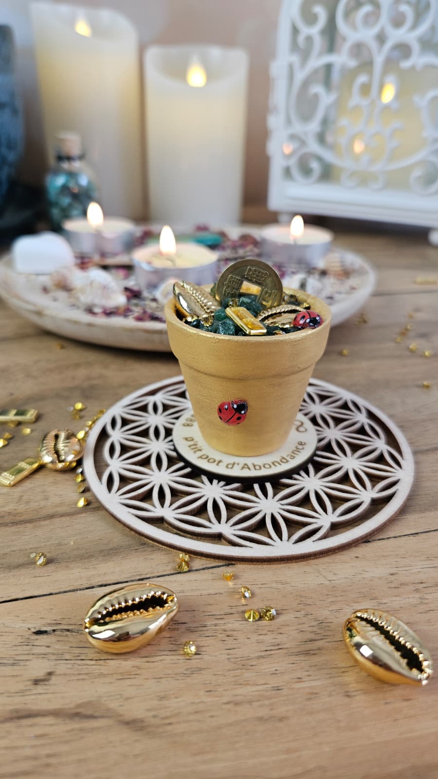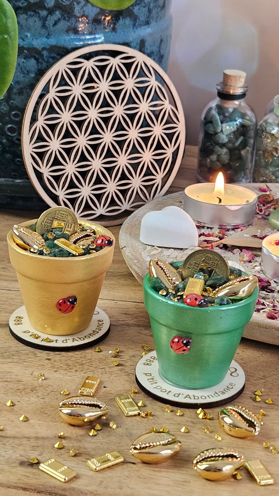 Voici la version à poser de mon P’tit Pot d’Abondance, spécialement imaginée pour accompagner vos rituels, créer un espace sacré ou vibrer au quotidien avec l’énergie de la prospérité.